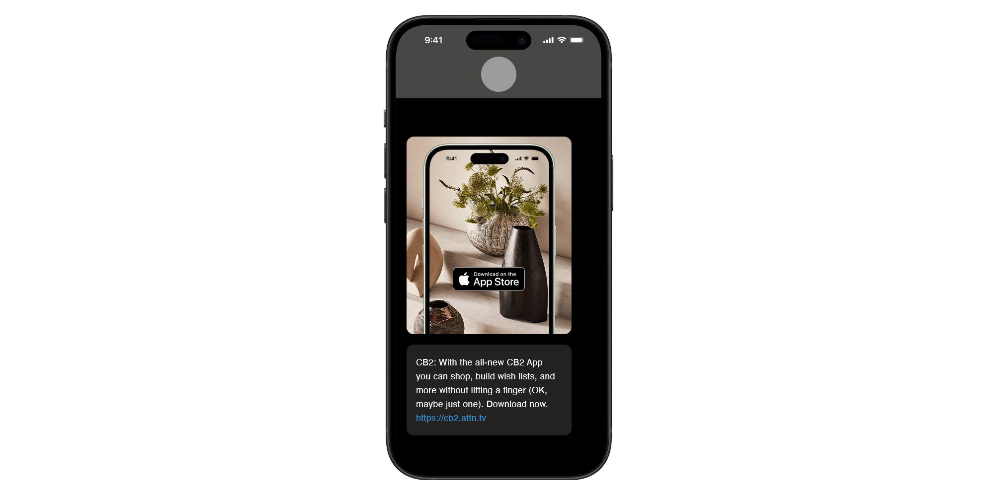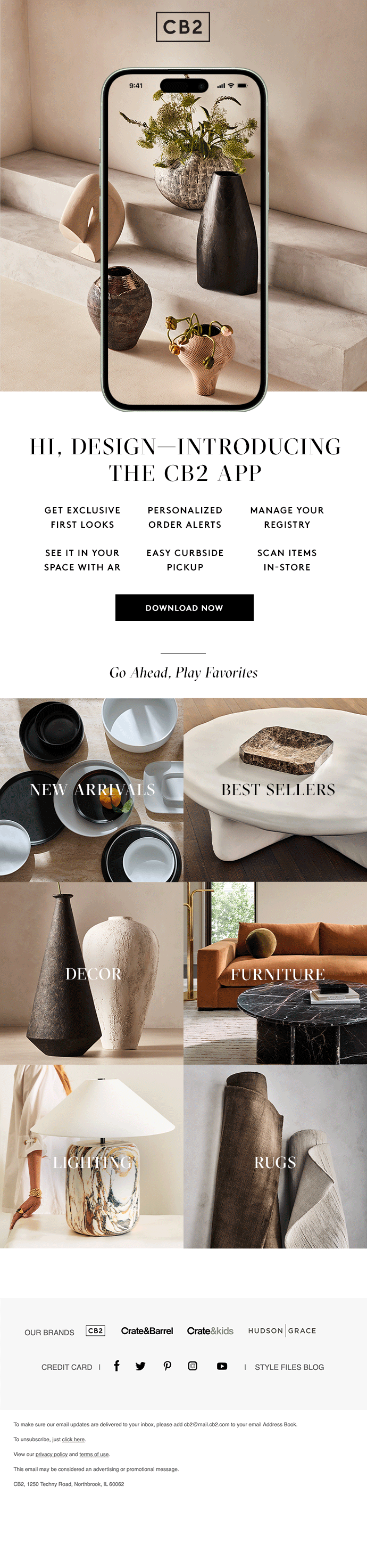 As Freelance Art Director at CB2, I was responsible for the Art Direction and some of the deliverables for marketing the new CB2 App, including: SMS, the dedicated email, and email banners. The Art Direction included a final look and feel, mockups, and a toolkit. The direction and files were also used by other team members for signage and Instagram stories.
