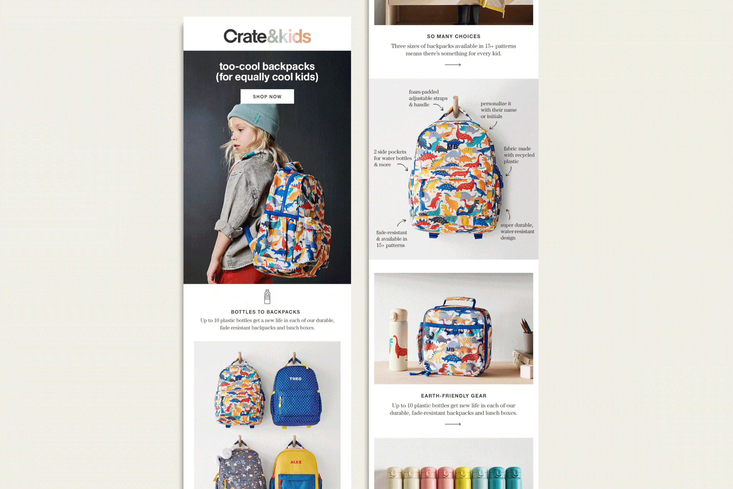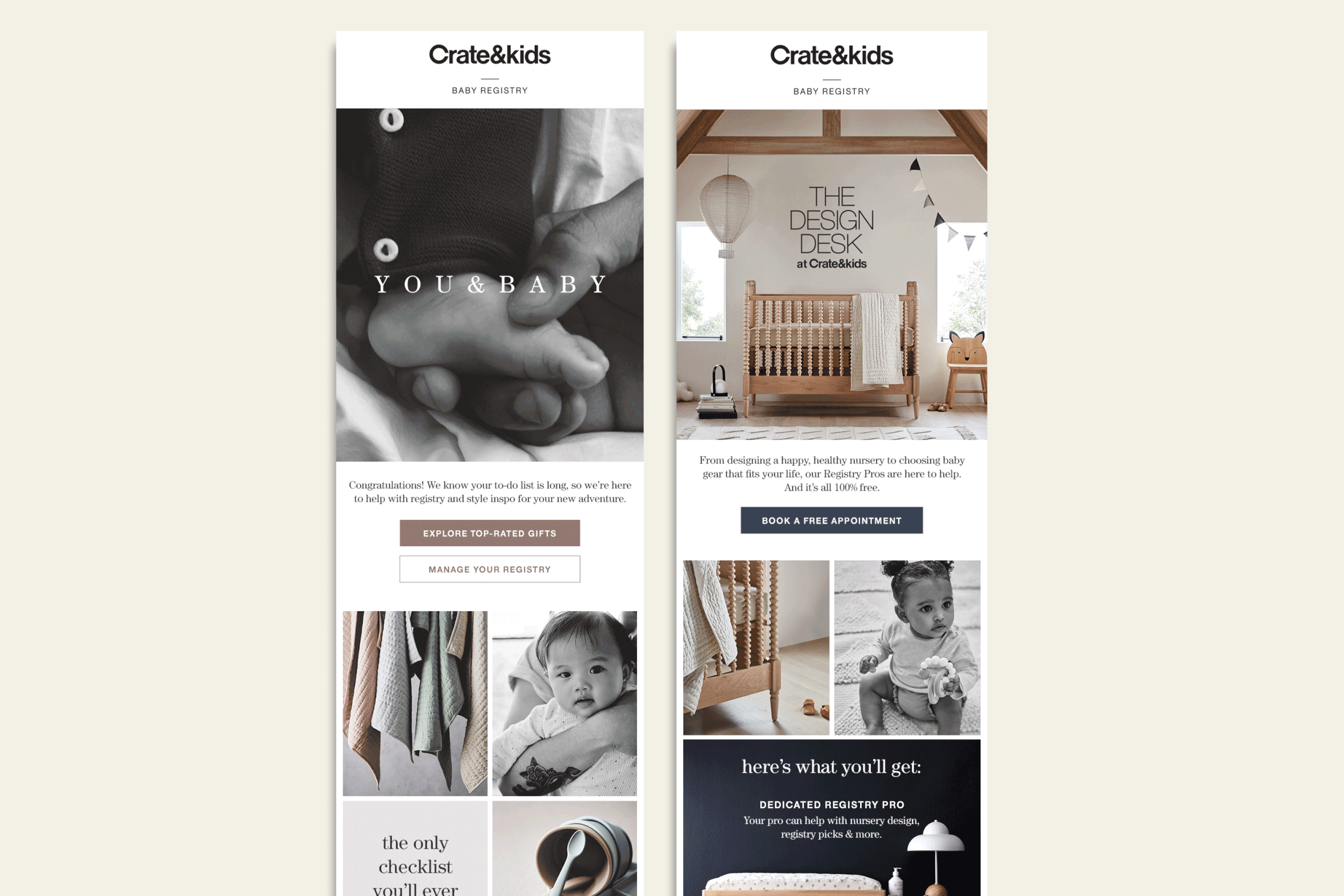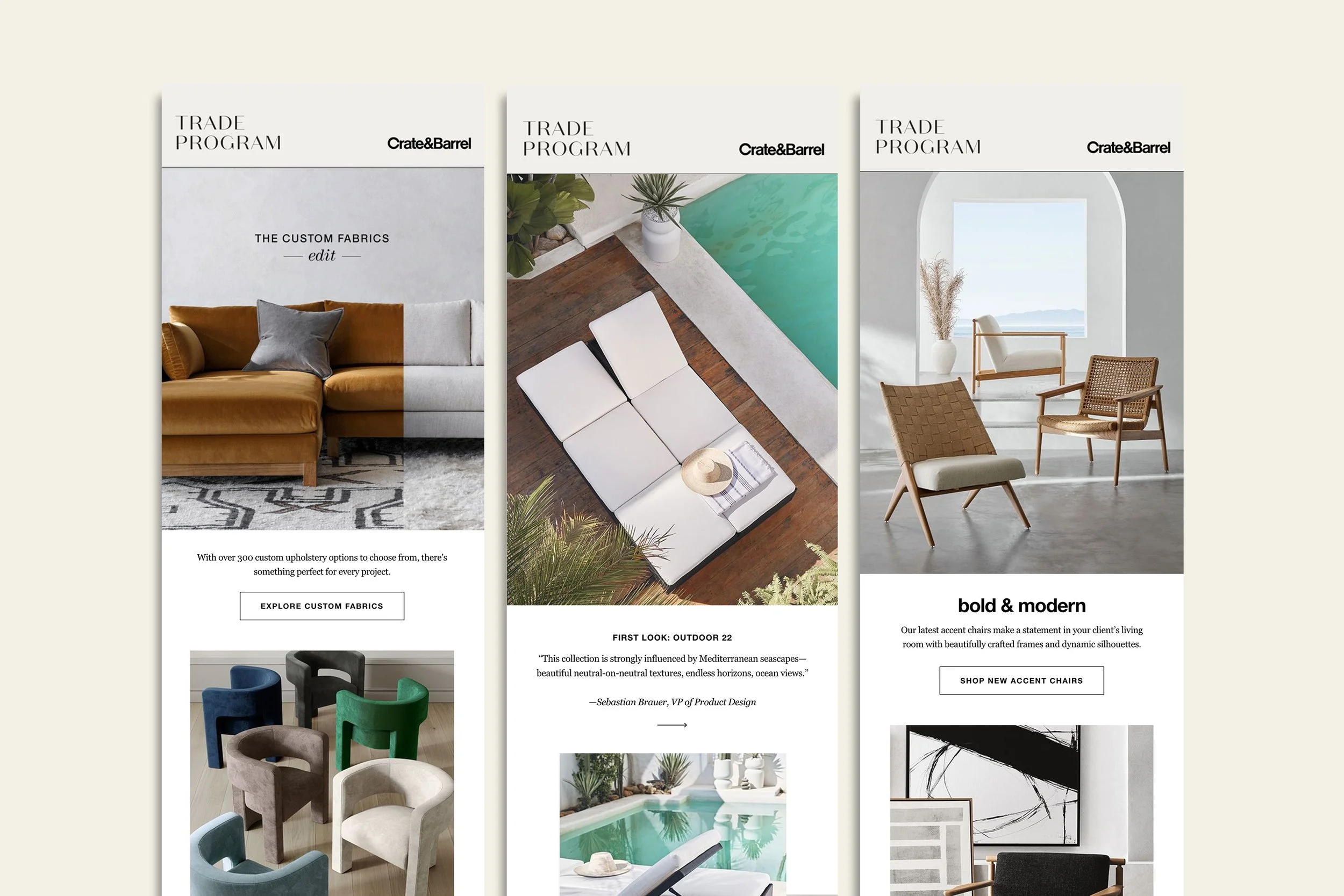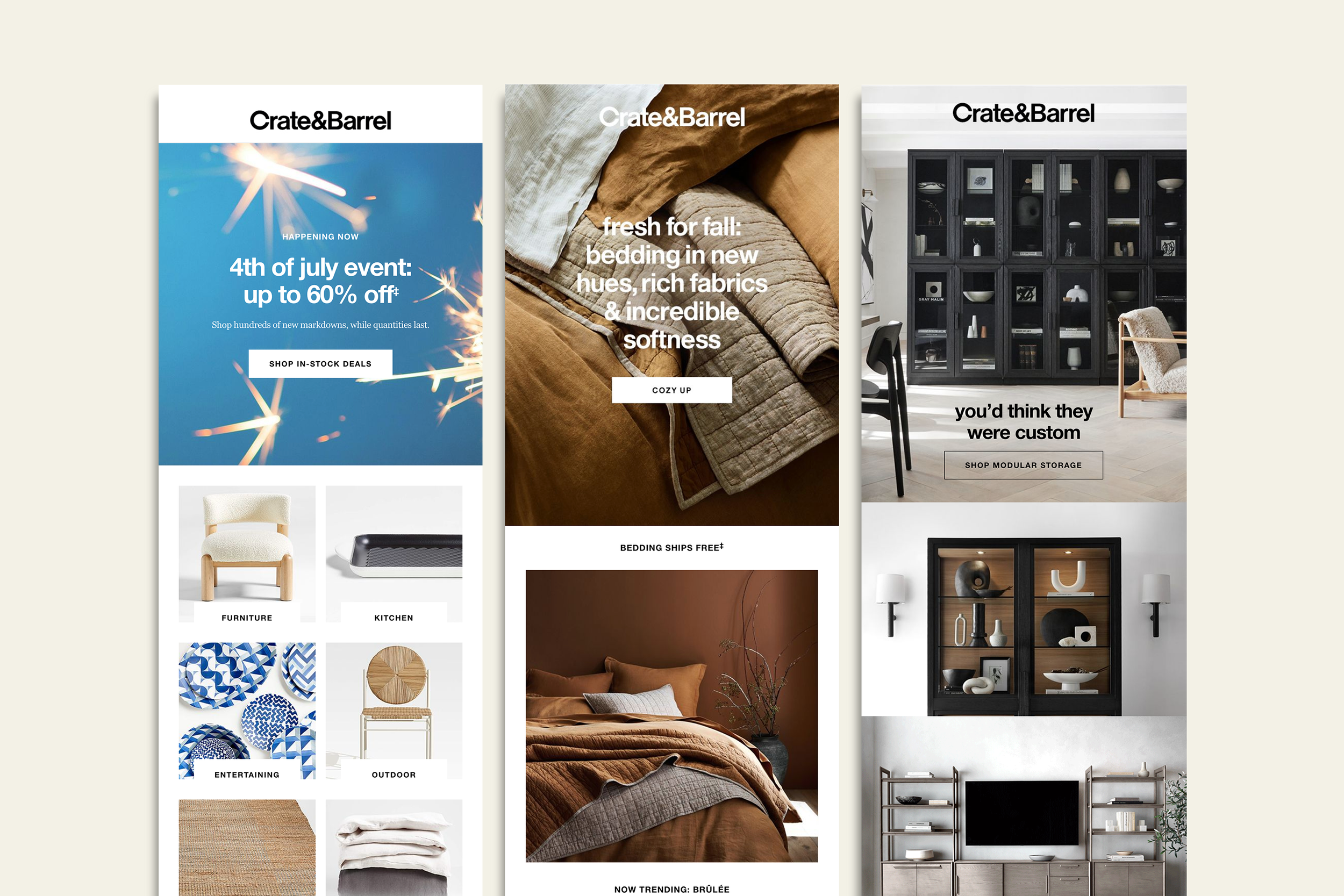 As Senior Art Director of Email at Crate and Barrel, I oversaw the Email Creative Team in the daily creation of emails for 2 brands and 3 business units. While there, I spearheaded the creation of a responsive, modular design system and updated the development process to include an email builder tool.