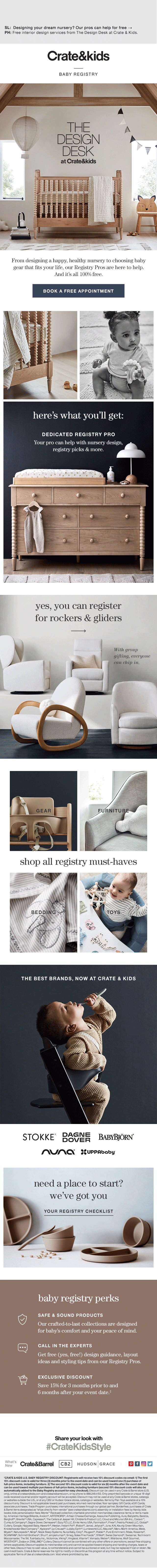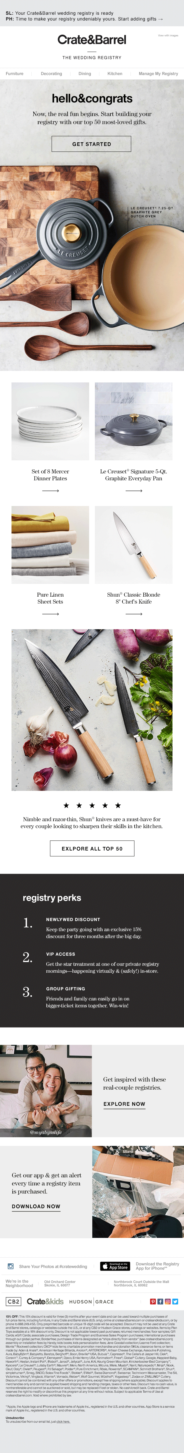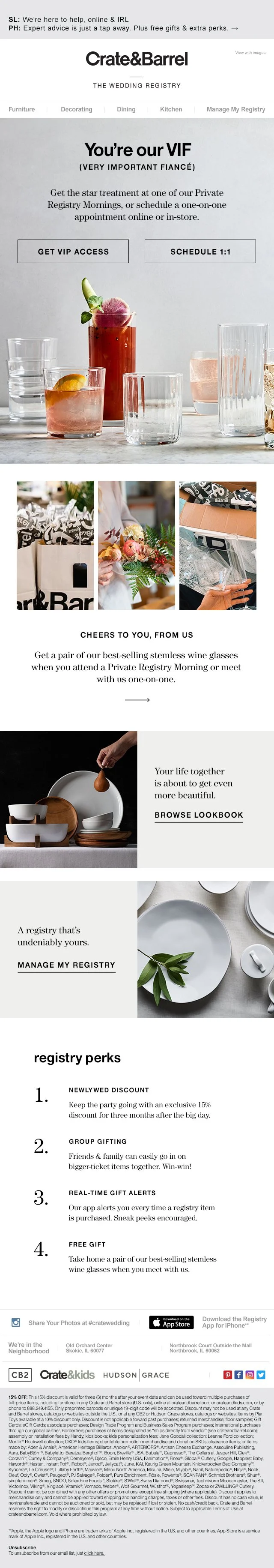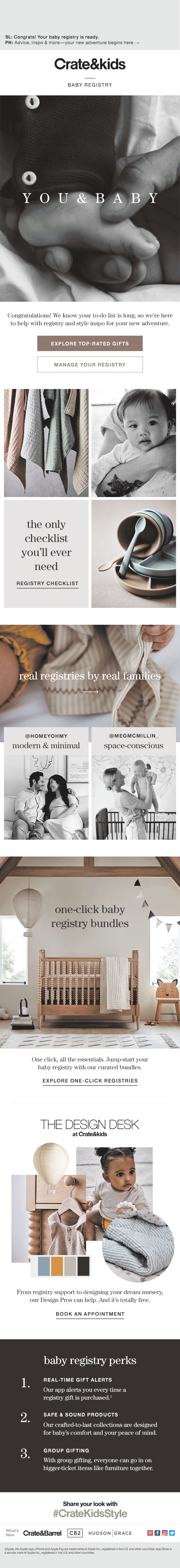 As Senior Art Director at Crate & Barrel I designed trigger emails for the freshly branded and re-launched Baby and Wedding Registry programs, as well as set channel standards and direction for how these were to be executed in daily bulk creative by my team.